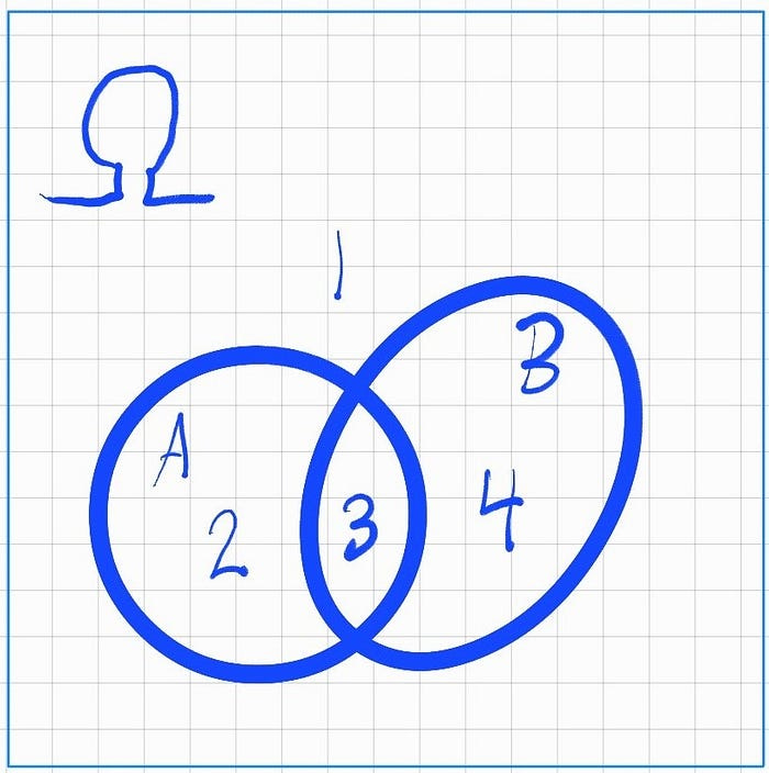 In the above illustration we have: Ω = {𝟏,𝟐,𝟑,𝟒} and the two events 𝐴={𝟐,𝟑} and 𝐵={𝟑,𝟒}. Notice how the two sets 𝐴 and 𝐵 share the element 𝟑, and that all sets are subsets of the sample space Ω. The notation for the shared element 𝟑 is 𝐴 ∩ 𝐵 = {𝟑}.